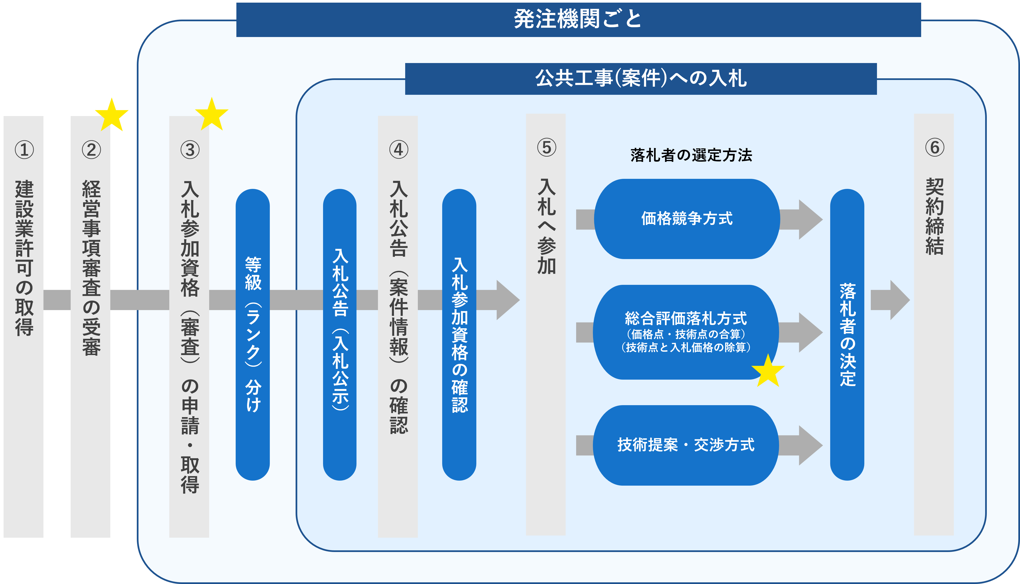 公共工事の発注機関では、入札に参加するための資格基準を定めており、業者の能力を評価するために「③入札参加資格審査」を行っています。