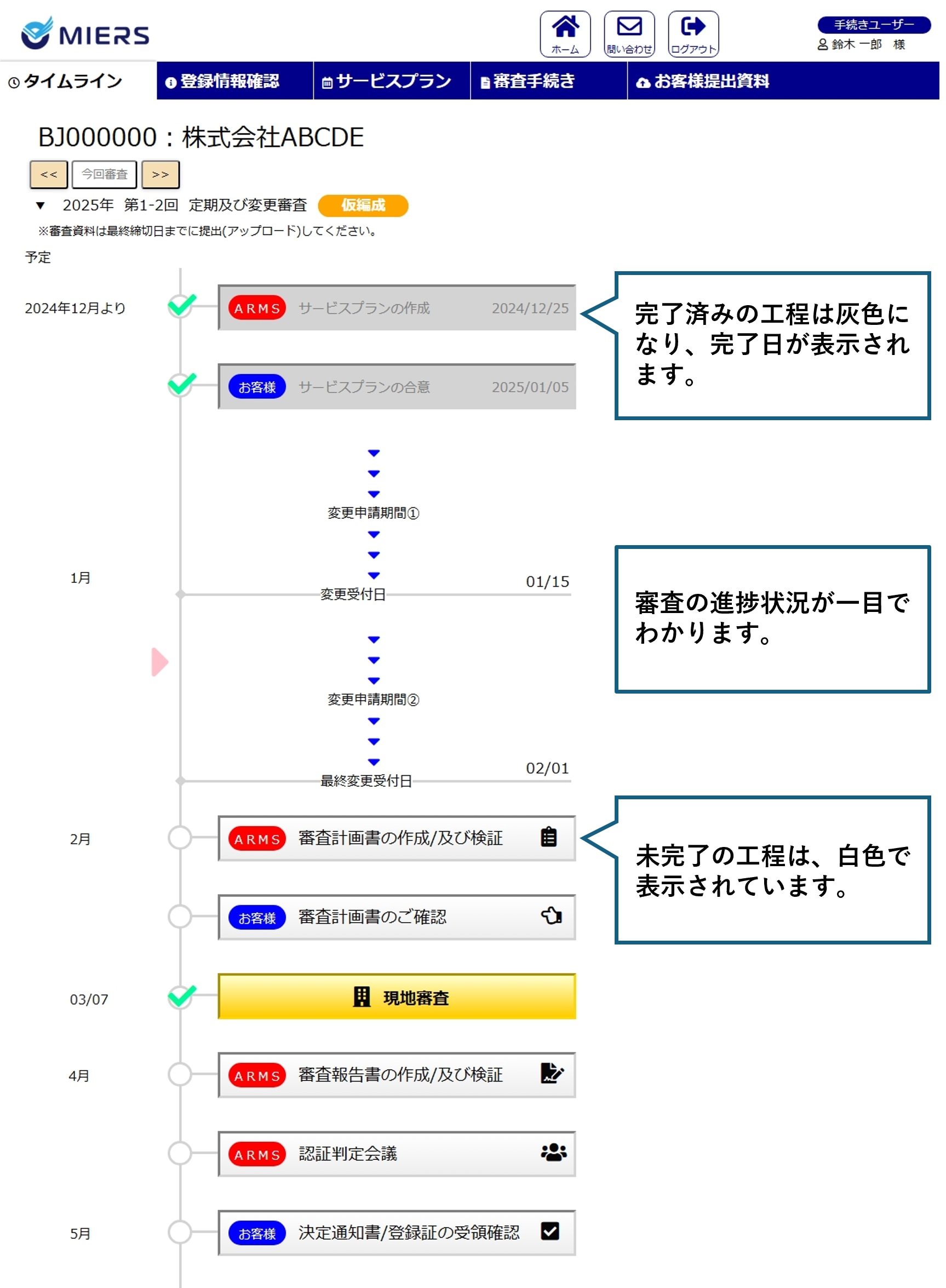 Web画面上で、審査手続きの進捗状況や1サイクル(定期審査・定期審査・更新審査)3年間の審査計画等を閲覧できます。