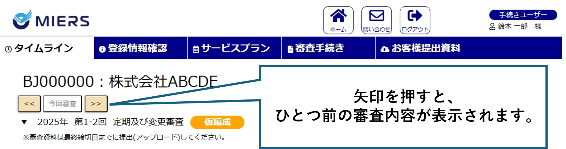 「審査の進捗状況の確認」のタイムライン画面などから、過去の審査を見直すことができます。