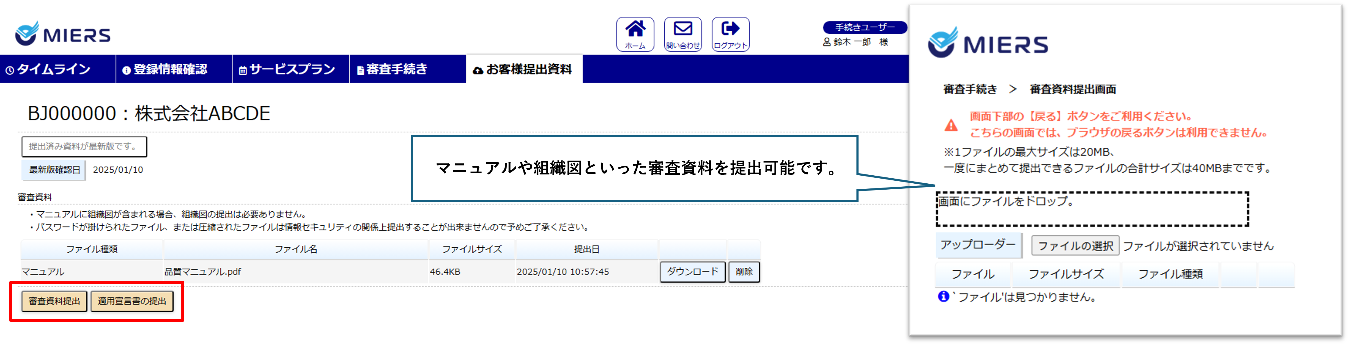 審査前の準備として、必要な審査資料をアップロードして提出することができます。