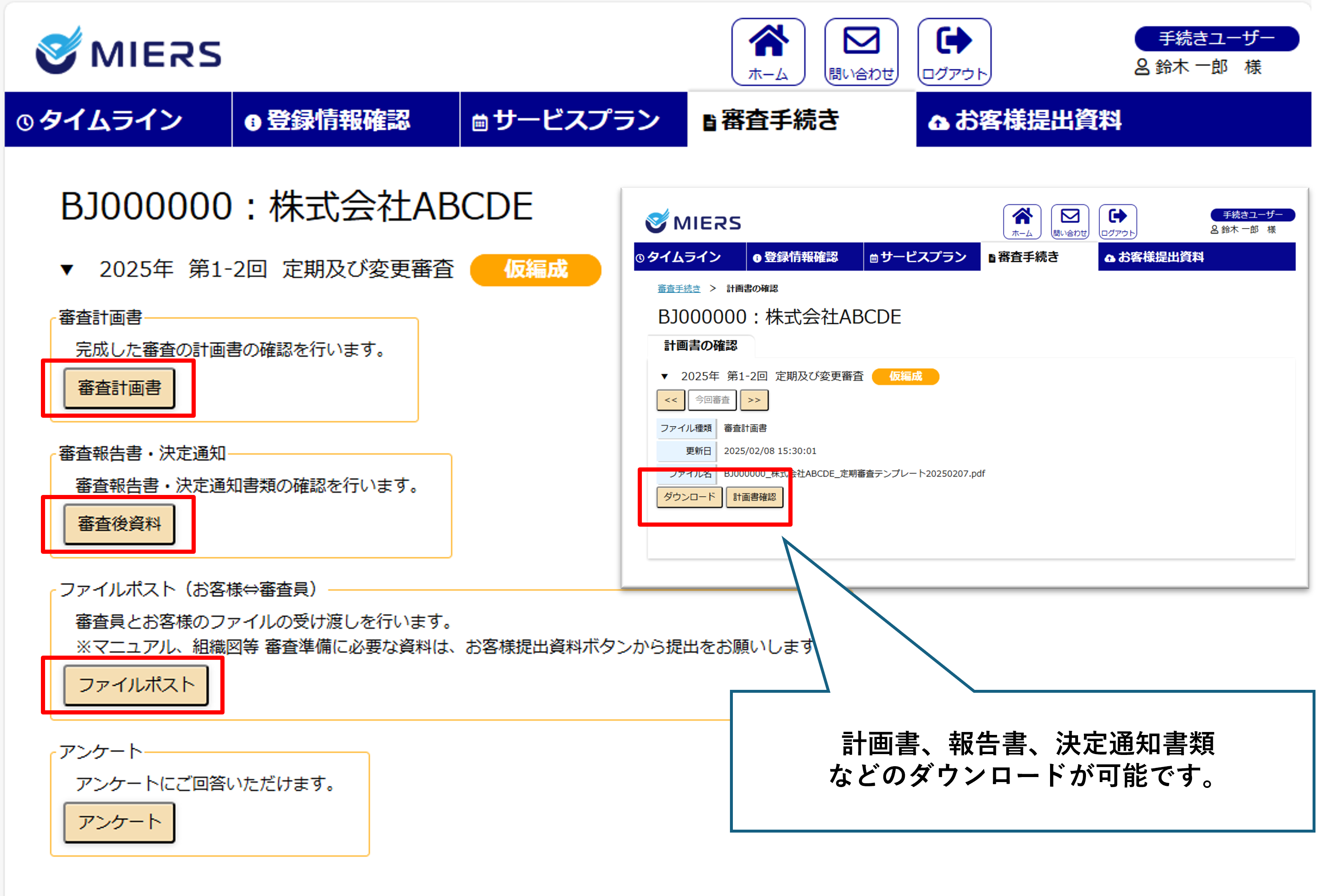 また、「お客様のお手続き」列にある手続き名称をクリックすることで、各種手続き(査資料のアップロード/審査計画書のご確認など)ができる画面に移動します。