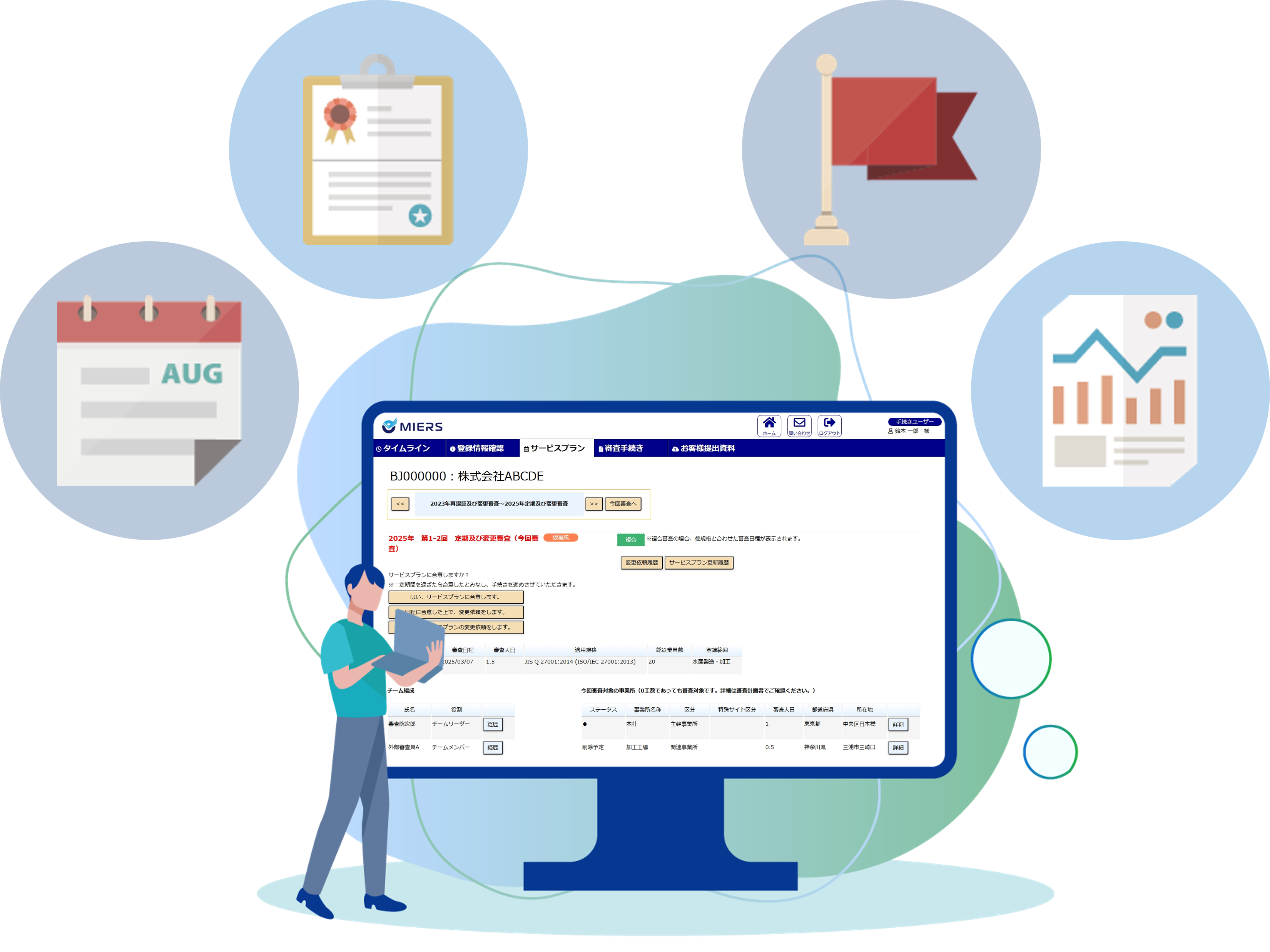 MIERS(ミエルス)は審査の準備のほか、現在および過去のマネジメントシステムの評価から、将来の審査プログラムまで、全体が「見える」Web手続きシステムです。