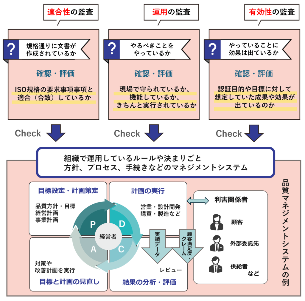 これらはそれぞれ、「適合性の監査」「運用の監査」「有効性の監査」という観点に当てはめることができます。
